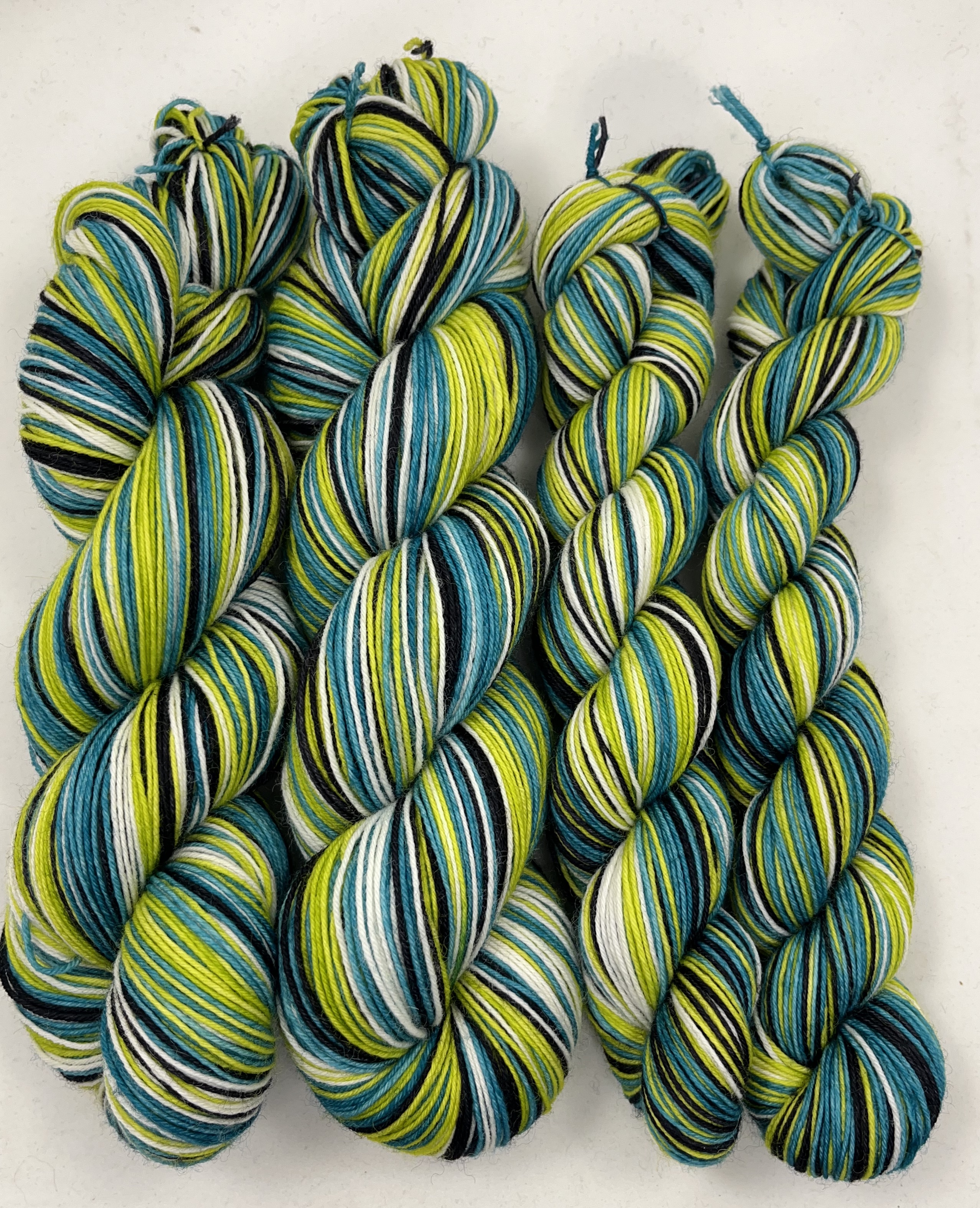 6 väriä. Sukkia neuloessasi raitojen leveys on n. 8 kerrosta (sukan varren leveys on 60 silmukkaa, puikkokoko 2,5 mm). Huomaa, että raidan leveys riippuu käyttämästäsi puikkokoosta, neuletiheydestä ja neuleen koosta. Lanka sopii kaikkeen neulontaan.
