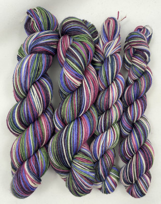 6 väriä ja sukkia neuloessasi raitojen leveys on n. 4 kerrosta (sukan varren leveys on 60 silmukkaa, puikkokoko 2,5 mm). Huomaa, että raidan leveys riippuu käyttämästäsi puikkokoosta, neuletiheydestä ja neuleen koosta. Lanka sopii kaikkeen neulontaan.