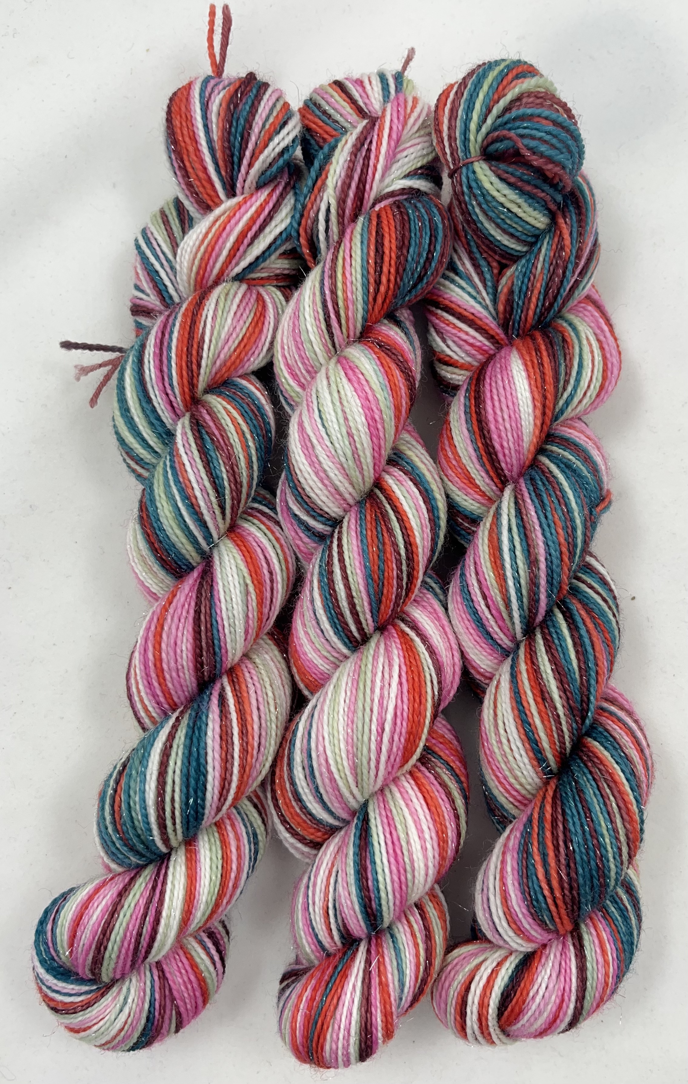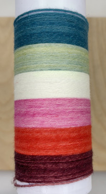 6 väriä. Sukkia neuloessasi raitojen leveys on n. 4 kerrosta (sukan varren leveys on 60 silmukkaa, puikkokoko 2,5 mm). Huomaa, että raidan leveys riippuu käyttämästäsi puikkokoosta, neuletiheydestä ja neuleen koosta.