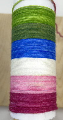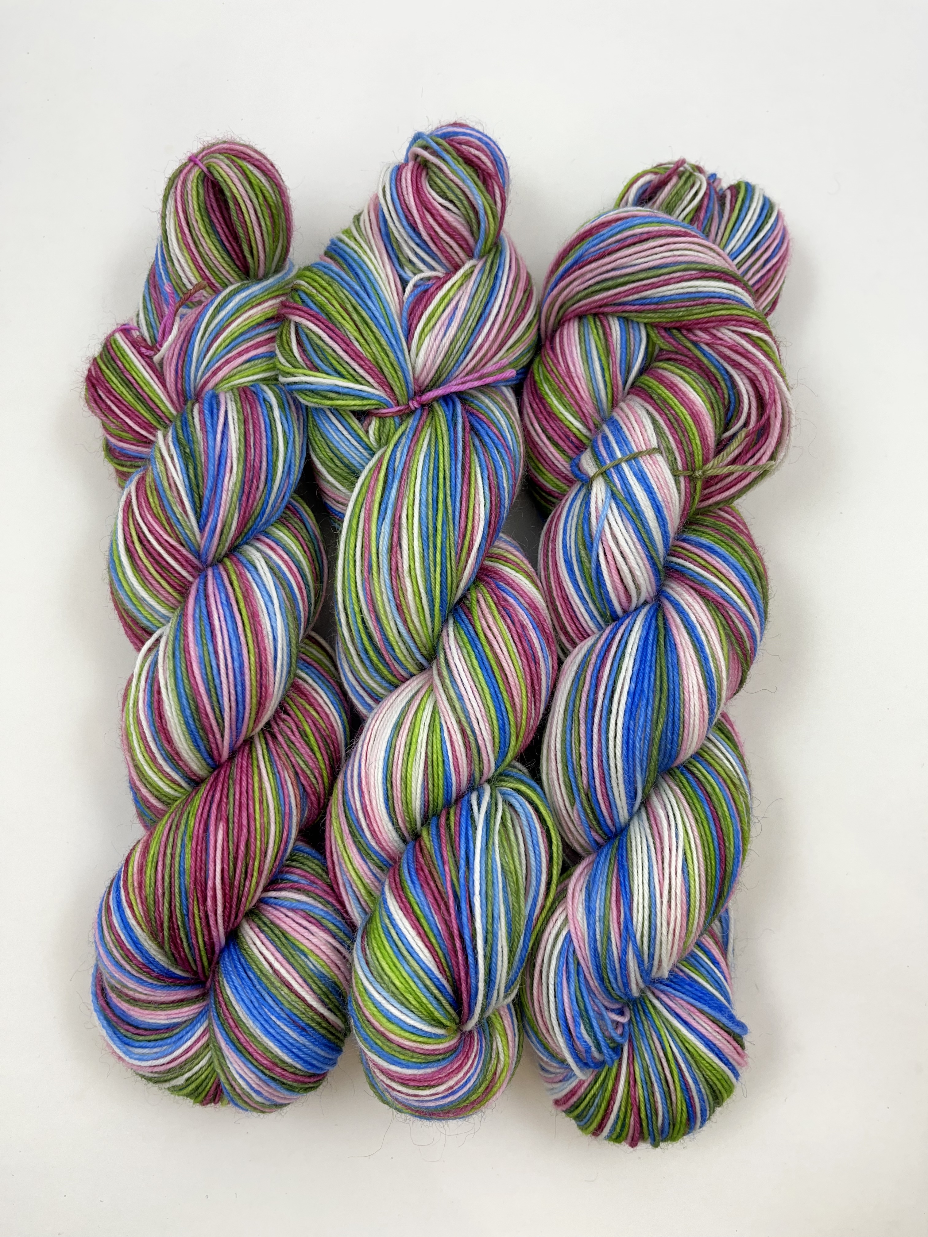 Itseraidoittuva sukkalanka, 6 väriä. Lanka sopii kaikkeen neulontaan. Sukkia neuloessasi raitojen leveys on n. 4 kerrosta (sukan varren leveys on 60 silmukkaa, puikkokoko 2,5 mm). Huomaa, että raidan leveys riippuu käyttämästäsi puikkokoosta, neuletiheydestä ja neuleen koosta.