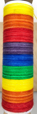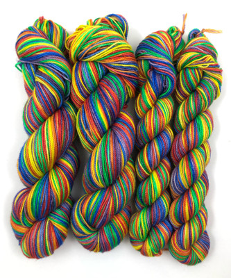 6 väriä. Sukkia neuloessasi raitojen leveys on n. 4 kerrosta (sukan varren leveys on 60 silmukkaa, puikkokoko 2,5 mm). Huomaa, että raidan leveys riippuu käyttämästäsi puikkokoosta, neuletiheydestä ja neuleen koosta.
